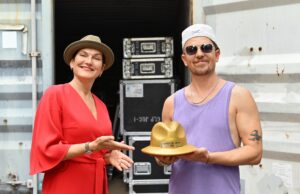 _Jan Delay ist „Hutträger des Jahres 2025“; Kirsten Reinhardt überreicht dem Musiker den Goldhut des Hutverbands GDH.